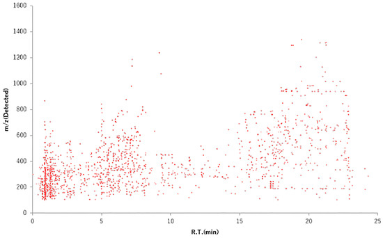 Plants contain numerous phytochemicals whose composition and content vary depending on the species. Flavonoids are categorized into subclasses depending on the basic structure. Soybeans contain flavonoids termed isoflavones [53] and onions contain quercetin [54]. The natural compounds in plant species have been characterized. As described in Section 2, wild watermelon is the original watermelon species, differing in properties from the common watermelon. This section describes the difference between wild watermelon and watermelon in terms of sugar content and phytochemical composition, including flavonoids. First, we evaluated the quantity of sugar contained in wild watermelon and watermelon using Brix concentration. The sugar contents of wild watermelon and watermelon were found to be 2°Bx and 8°Bx, respectively. The sugar quantity contained in watermelon was four times that in wild watermelon. Next, to investigate the constituents of wild watermelon in detail, we performed a metabolome analysis [36]. From the m/z value in Figure 3, many phytochemicals were confirmed to be low-molecular-weight constituents rather than high-molecular-weight constituents. The vertical axis shows the m/z value, that is, the dimensionless mass. The horizontal axis shows the mass detection time during analysis. Based on the analysis conditions, it was expected that the earlier the detection time, the more water-soluble constituents would be detected, and the later the detection time, the more fat-soluble constituents would be detected. Figure 3 shows that many constituents retained in the ODS column are eluted and detected with low-concentration organic solvents (acetonitrile). The analysis suggested that WWMJ may contain many water-soluble constituents. In an exhaustive analysis, flavones, flavonols, and flavanones were found to be abundant among the polyphenols, accounting for 31%, 16%, and 17% of the total polyphenols, respectively [36]. We detected some WWMJ constituents using a mass spectrometer (triple quadrupole, QQQ, Agilent technologies, Santa Clara, CA, USA) which were glycosylated flavonoids and aglycons. The detected polyphenol aglycon part and viral activity are shown in Table 1. From these results and reports [36], plant or WWMJ flavonoids are suggested to contribute to the anti-influenza virus activity. However, it is also necessary to consider the amount of these phytochemicals, the IC50 value, and the synergistic effect between phytochemicals.