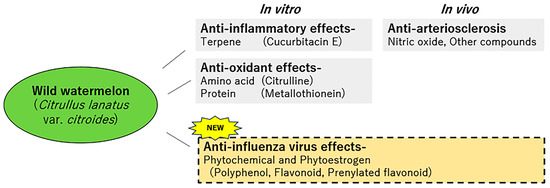 The functionality of wild watermelon remained unclear until the 2000s; however, the mechanism of antioxidation has been studied and is gaining attention in Japan. The results obtained by Fujie et al. [48] suggested the possibility of a therapeutic approach utilizing wild watermelon for arteriosclerosis caused by lifestyle-related diseases. Our study suggests that unbred wild plants are a useful source for antiviral strategies. Ancient plants might have a high amount of active ingredients, but plants and foods are now being bred to suit our tastes. Other food functionality reports [68,69,70] also suggest that wild-type plants and foods have high functionality and may contain characteristic ingredients. To reap the benefits of plants and food, we should use varieties that are closer to their wild origins rather than plants bred to suit our tastes. Our study is the first to report on the novel functionality and anti-influenza virus effect of WWMJ (Figure 5). We emphasize that WWMJ is an excellent food material that can be utilized in multiple perspectives for the prevention and treatment of influenza. As WWMJ has a characteristic composition that contains phytochemicals such as phytoestrogen, in addition to its inhibitory effect on viral growth, we expect extensive research and development focused on wild watermelon in various fields in the future.