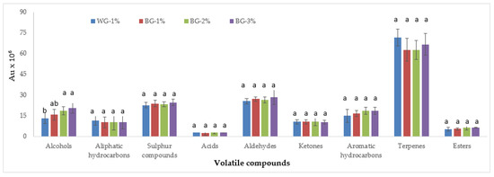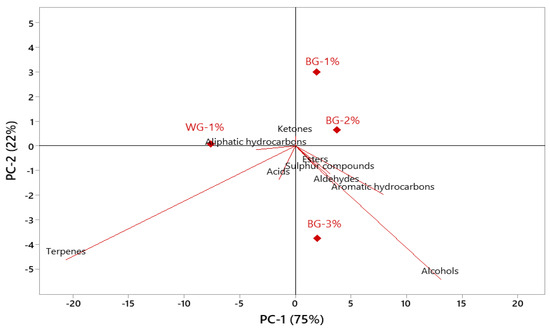 Principal component analysis was carried out to evaluate the relationships between black garlic treatments and chemical groups (Figure 3). PC1 provided 75% of the variance, while PC2 provided 22%. Thus, the first two PCs provided 97% of the total variance. PC1 separated all groups containing different amounts of BG from WG-1%, and these groups were on the positive side of PC1. In contrast, WG-1% was on the negative side of PC1 and positively correlated with terpenes, aliphatic hydrocarbons, and acids. BG-containing groups showed a positive correlation with esters, sulfur compounds, aldehydes, aromatic hydrocarbons, and alcohols, but these chemical groups were more closely correlated with BG-3% (Figure 3).