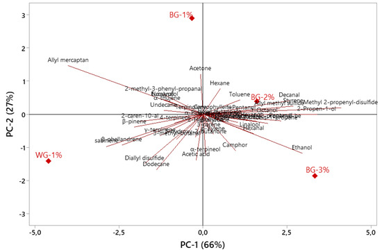 The principal component analysis of the relationships between black garlic treatments and volatile compounds is given in Figure 4. PC1 and PC2 explained 66% and 27% of the variation, respectively. In other words, the first two principal components explained 93% of the total variance. WG-1% and BG-1% groups were placed on the negative side of PC1, while BG-2% and BG-3% groups were placed on the positive side of PC1. Diallyl disulfide, which is one of the main factors that causes the pungent and spicy smell of garlic, showed a close correlation with WG-1%. As a matter of fact, it was determined that this compound is more concentrated in white garlic than in black garlic [5,24,26]. Similarly, allyl mercaptan had a closer correlation with the WG-1% and BG-1% groups. Kim et al. [24] also found that allyl mercaptan is more closely related to white garlic.