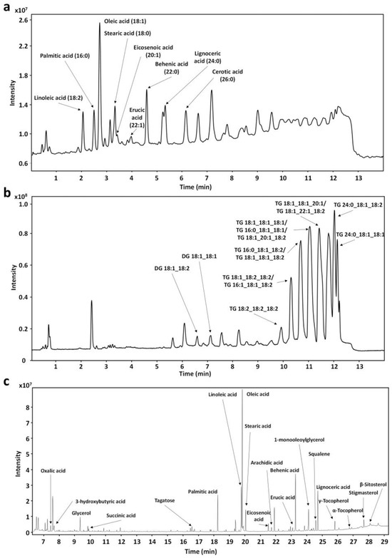 Total ion current (TIC) chromatograms with the most abundant annotated compounds analyzed by HPLC-CSH-Q-TOF MS/MS in ESI negative ion mode (a), ESI positive ion mode (b), and GC-Q-TOF MS (c).
