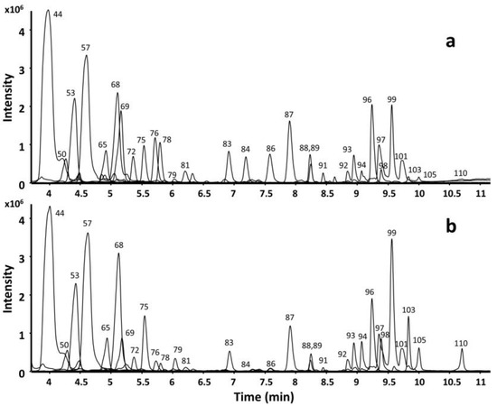 The optimum PLE80 and PLE12.5 extracts (Section 2.4) were dissolved in EtOH to a final concentration of 3 mg/mL. Then, samples were vortexed for 30 s, centrifuged at 14,800 rpm for 5 min at 4 °C and the supernatants were collected and stored at −80 °C until analysis. Aliquots of 2 μL were injected into the same HPLC-Q-TOF MS/MS instrument as specified above. Compounds were separated using an Eclipe Plus C18 analytical column (100 mm × 2.1 mm, particle size 1.8 μm) and a C18 guard column (0.5 cm × 2.1 mm, particle size 1.8 μm), both from Agilent. Milli-Q water was used as mobile phase (A) and ACN as mobile phase (B), and 0.1% formic acid was used as a mobile phase modifier. The column temperature was held at 40 °C and the flow rate was set to 0.5 mL/min, with the following gradient: 0–30% B in 7 min; 30–80% B in 9 min; 80–100% B in 11 min; and 100% B for 14 min. The mass spectrometer was operated in ESI positive and ESI negative modes, using the following parameters: capillary voltage of 3000 V for ESI positive and −3000 V for ESI negative; mass range from 25 to 1100 m/z; nebulizer pressure of 40 psig; and drying gas flow rate of 8 L/min and 300 °C. The sheath gas flow was 11 L/min at 350 °C. MS/MS analyses were performed employing the auto MS/MS mode using five precursors per cycle, dynamic exclusion after two spectra (released after 0.5 min), and collision energies of 20 and 40 V. Mass accuracy was corrected as explained above. Data processing was performed using MS-DIAL (v.4.8) software, and MS/MS spectra from NIST20, LipidBLAST, and the MoNA databases were used for the tentative identification of compounds 1–42, 100–104, and 106–114. Moreover, the most abundant compounds annotated as “unknowns” by MS-DIAL (v.4.8) software were individually inspected and tentatively identified by combining SIRIUS 4 software [27], the manual interpretation of their acquired MS/MS spectra, and taking into consideration their retention times. Peak areas were normalized by the total sum of identified peaks in each sample. Principal component analysis (PCA), partial least squares discriminant analysis (PLS-DA), and two-sample t-test were performed with the MetaboAnalyst 5.0 website tool (https://www.metaboanalyst.ca, accessed on 1 August 2023), and differences between metabolites were considered significant when p < 0.05.