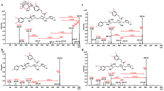 Compound 53 (Figure 4c) was tentatively identified as N-dihydrocoumaroyl-N’-dihydrocaffeoyl spermidine, as it exhibited a [M + H]+ ion at m/z 458.26, and fragment ions at m/z 441.24 [M + H-NH3]+, 310.21 [M + H-dihydrocoumaroyl]+, 293.19 [M + H-NH3-dihydrocoumaroyl]+, 222.11, 206.12, 165.05 [dihydrocaffeoyl]+, 123.04, and 72.08; and a [M-H]− ion at m/z 456.25, with fragment ions at m/z 334.41 [M-H-122]−, 308.20 [M-H-dihydrocoumaroyl]−, 186.16 [M-H-122-dihydrocoumaroyl]−, and 121.03. Based on the same premises as compound 44, a non-linear (N1–N5– or N5–N10–) configuration of this compound is proposed. Moreover, compound 66 ([M + H]+ ion at m/z 536.28) was tentatively identified as N-dihydrocoumaroyl-N’-dihydrocaffeoyl spermidine conjugate (+C5H2O). It presents a characteristic ion of N-dihydrocoumaroyl-N’-dihydrocaffeoyl spermidine (at m/z 441.24 [M + H-C5H5NO]+), and other related fragment ions at m/z 293.18 [M + H-C5H5NO-dihydrocoumaroyl]+, 277.19 [M + H-C5H5NO-dihydrocaffeoyl]+, 222.11, 206.12, and 165.05 [dihydrocaffeoyl]+ in ESI (+). It also presents fragment ions at m/z 439.22 [M-H-C5H5NO]−, 386.20 [M-H-dihydrocoumaroyl]−, 291.17 [M-H-C5H5NO-dihydrocoumaroyl]−, and 94.03 in ESI (-). Additionally, compound 79 ([M + H]+ ion at m/z 500.27) and compound 91 ([M + H]+ ion at m/z 536.28) were tentatively identified as N-dihydrocoumaroyl-N’-dihydrocaffeoyl spermidine conjugates (+C2H2O for compound 79 and +C5H2O for compound 90). These inferences were based on the presence of fragment ions at m/z 222.11 and 165.05 and neutral losses of 148.05 (dihydrocoumaroyl, –C9H8O2) in ESI (+); and fragment ions at m/z 121.03 and neutral losses of 148.05 (dihydrocoumaroyl, –C9H8O2) and 122.04 (–C7H6O2) in ESI (−) (see Table S9, Supplementary Materials for more details). However, as none of these compounds present the characteristic ion of the non-linear (N1–N5– or N5–N10–) configuration of N-dihydrocoumaroyl-N’-dihydrocaffeoyl spermidine (m/z at 441.24), a linear (N1–N10–) configuration for these compounds is proposed.