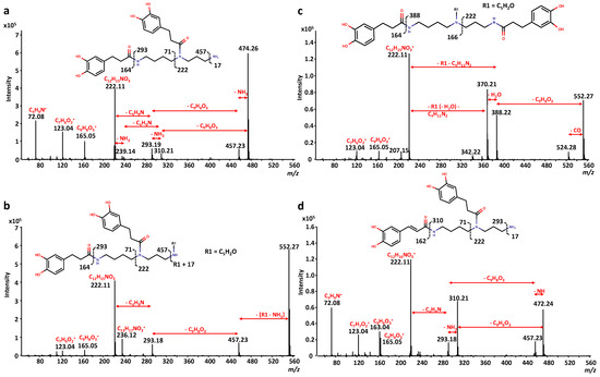 Based on the previous information, compounds 44 and 47 were identified as N-N’-bis-(dihydrocaffeoyl) spermidine isomers, with [M + H]+ ions at m/z 474.26, and fragment ions at m/z 457.23 [M + H-NH3]+, 310.21 [M + H-dihydrocaffeoyl]+, 293.19 [M + H-dihydrocaffeoyl-NH3]+, 222.11, 165.05 [dihydrocaffeoyl]+, 123.04, and 72.08 in ESI (+). Moreover, compound 44 had a [M−H]− ion at m/z 472.24, with fragment ions at m/z 350.21 [M-H-122]−, 308.20 [M-H-dihydrocaffeoyl]−, 186.16 [M-H-dihydrocaffeoyl-122]−, and 121.03 (Figure 3a). Based on a neutral loss that yields a m/z at 457.23 (NH3 loss) as a first fragment and a subsequent hydrogen rearrangement in ESI (+) mode, we propose a non-linear configuration (N1–N5– or N5–N10–) of compounds 44 and 47. In addition, the MS/MS spectra of N-N’-bis-(dihydrocaffeoyl) spermidine were previously reported [41], which perfectly matched those obtained in the present work. Based on the similar MS/MS fragmentation pattern as compounds 44 and 47, compounds 46, 52, 54, 56, 57, 59–64, 67–75, 77, and 80 were tentatively identified as N-N’-bis-(dihydrocaffeoyl) spermidine conjugates, with a non-linear configuration (N1–N5– or N5–N10–). All these compounds present at least two characteristic ions from N-N’-bis-(dihydrocaffeoyl) spermidine (474.26, 457.22, 222.11, and/or 165.05 m/z) in ESI (+), and most of them had neutral losses of 164.05 (dihydrocaffeoyl, -C9H8O3) and 122.04 (–C7H6O2) in ESI (−) (see Table S9, Supplementary Materials). A proposed MS/MS interpretation for compound 57 in ESI (+) is shown as an example in Figure 3b. A non-linear configuration (N1–N5– or N5–N10–) is proposed based on a neutral loss of 95.04 (–C5H5NO) as a first fragment (instead of a NH3 loss), with a subsequent dihydrocaffeoyl (–C9H8O3) loss. The same behaviour was observed for the other compounds.