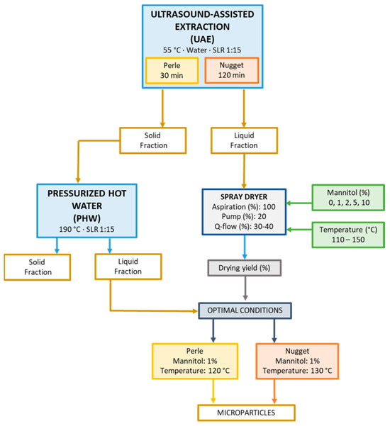 The polymer used as the carrier was mannitol, widely used for pharmaceutical applications due to its high compatibility and inert properties. In order to establish the operation conditions to formulate the microparticles, the UAE extract from both varieties was dried using mannitol (1, 2, 5 and 10%, w/w) as the carrier at 120 °C and 130 °C for Perle and Nugget, respectively.