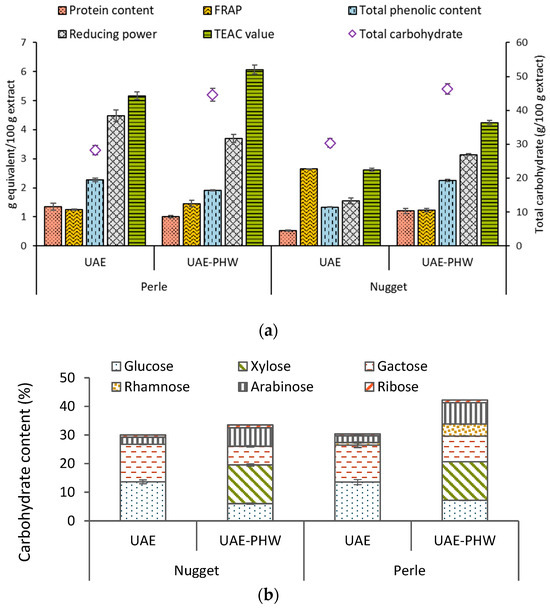 Total phenolic content, protein content, and TEAC value results (a) and carbohydrate content (b) for both varieties (Perle and Nugget), using ultrasound-assisted extraction (UAE) and the sequence of ultrasound-assisted extraction and pressurized hot water extraction (UAE-PHW). Note: TEAC: Trolox equivalent antioxidant capacity; FRAP: Ferric reducing antioxidant power.