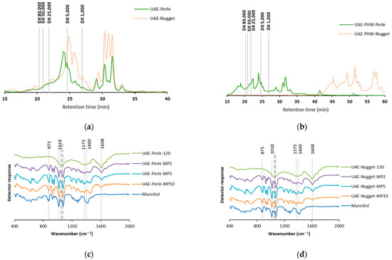 Profile of molar mass distribution of the liquid phases obtained after (a) ultrasound-assisted extraction (UAE) and (b) the sequential extraction UAE and pressurized hot water extraction (UAE-PHW), and spectra of FTIR of the extracts obtained after ultrasound-assisted extraction (UAE) and the microparticles (MP) formulated with mannitol at different contents: MP2 (2%), MP5 (5%), and MP10 (10%) for Perle (c) and Nugget (d). The solid line represents mannitol; the corresponding wavenumbers (1053 and 1070 cm−1) are plotted as dashed lines.