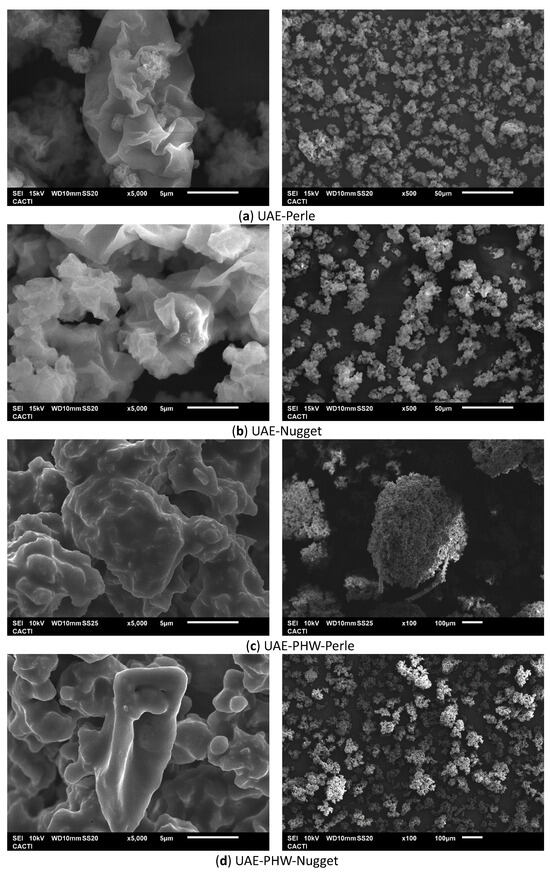 Scanning electron microscopy images of selected microparticles (1% mannitol) obtained after ultrasound-assisted extraction (UAE) and the sequential extraction process (UAEPHW) for the Perle and Nugget varieties from H. lupulus. Note: Magnitudes of the images of UAE Perle and Nugget: ×5000 and ×500; and images of UAE-PHW Perle and Nugget: ×5000 and ×100.