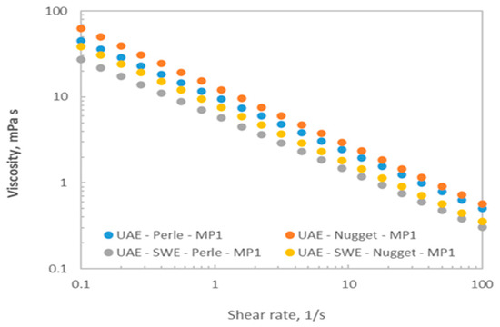 Figure 5 shows the viscoelastic profiles of representative microparticulate systems measured at 25 °C, selected based on their spray-drying yields. The knowledge of their rheological properties is essential during processing to extend their possible applications. All dispersions exhibited non-Newtonian behavior, being the shear-thinning profiles successfully described by the well-known power law model (R2 > 0.989). The drop in the apparent viscosity over the tested shear rate range was similar for all tested dispersions (about 2 decades). At a fixed shear rate, the microparticles from Perle featured lower apparent viscosity when compared to those formulated with Nugget, independently of the selected extraction treatment. For both hop varieties, it was also observed that microparticles subjected to the sequential UAE-PHW processing presented lower viscosity than those made from ultrasound extracts, confirming the expected and previously mentioned hydrolysis of polysaccharidic fractions.