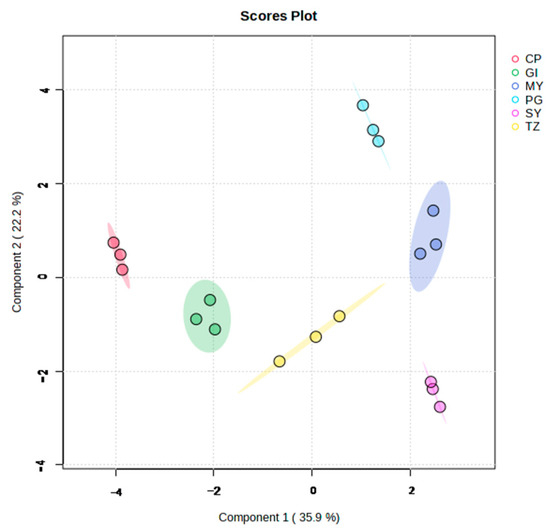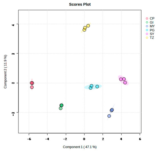 Unsupervised PCA is a powerful technique to describe significant trends in data. The principal components are created from a data matrix of samples and variables, representing the majority of the original variables’ information [22]. Therefore, only a few principal components could effectively describe a significant variability percentage. In the current study, PCA was used to examine differences between strawberry samples from various groups using MetaboAnalyst (http://www.metaboanalyst.ca, accessed on 11 September 2023). The data were log10-transformed and Pareto scaled before PCA.