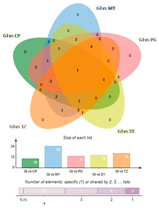 Differential metabolites were identified using VIP (VIP > 1) and absolute log2FC (|log2FC| ≥ 1.0). Overall, 35 differential volatile compounds (32 upregulated and three downregulated) were identified between GI and CP; 40 differential volatile compounds (31 upregulated and nine downregulated) between GI and MY; 31 differential volatile compounds (10 upregulated and 21 downregulated) between GI and PG; 50 differential volatile compounds (39 upregulated and 11 downregulated) between GI and SY; and 18 differential volatile compounds (four upregulated and 14 downregulated) between GI and TZ. Furthermore, the differential volatile compounds were ranked to effectively understand the changes in the major differential volatile compounds between GI and non-GI strawberries (Figure S4). The major differential volatile compounds in GI strawberries were esters and ketones. Finally, the Wenn plot (Figure 2) displayed the relationship between differential volatile compounds in each group. This demonstrated that isoamyl butyrate and trans-2-octen-1-ol could be used as characteristic markers of GI strawberries.
