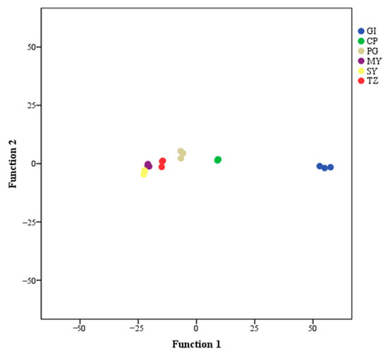 FDA was performed on the six groups of samples in the present study based on three characteristic markers to monitor the degree of variation of the metabolites (Figure 5). Strawberries were divided into six categories, and GI strawberries were significantly separated from the other groups.