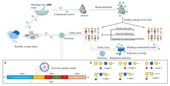 Schematic diagram of NoVs propagation. After humans are infected with NoVs, they are carried in feces and vomit, which are discharged via precipitation and sewage treatment plants into the waters where oysters thrive. NoVs enter oysters and bioaccumulate, and the risk of transmitting NoVs to humans after simple processing or direct raw food consumption remains. In addition, NoVs can also contaminate drinking water sources and form a human-to-human transmission. (a) NoV particle model and genome structure of NoV. (b) Structural diagram of HBGAs. Yellow circle: galactose (Gal); red triangle: fucose (Fuc); blue square: N-acetylglucosamine (GlcNAc); yellow square: glucose (Glc).
