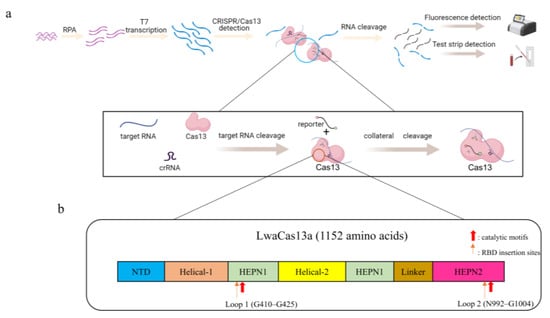 (a) Schematic diagram of the RPA-CRISPR/Cas13a assay principle. The samples are first amplified via RPA, and then a large amount of target RNA is generated by T7 transcriptase. The CRISPR/Cas13 system recognizes the target RNA by crRNA and then undergoes cis- and trans-cleavage to signal the RNA reporter. The detection results are visualized using fluorescence detection or test strip detection. (b) Domain organization of LwaCas13a. The catalytic motifs R474–H479 in HEPN1 and R1046–H1051 in HEPN2 are marked in red. The loop regions inserted by RBD G410–G425 (Loop 1) and N992–G1004 (Loop 2) are marked in orange.