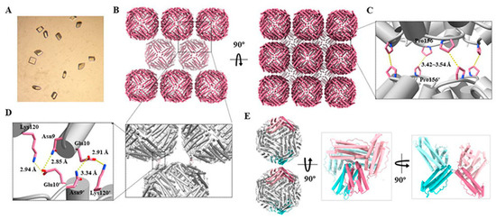 X-ray diffraction (PDB ID: 8IQV) characterization of AfFer. (A) Optical microscope image of AfFer crystals at pH 8.0, 15% (v/v) ethanol, and 200 mM MgCl2. (B) Side and top views of the 3D AfFer arrays in the crystal structure. (C) Close-up view of the proline residues at the C4 interface between two adjacent AfFer molecules. (D) Close-up view of the electrostatic interactions between two adjacent AfFer molecules along the C3 interface. (E) The C3 interfaces directly involved in AfFer’s intermolecular interactions. The subunits involved in electrostatic interaction are highlighted as dark pink and dark turquoise, and other subunits constituting the C3 interface are highlighted as pale pink and turquoise.