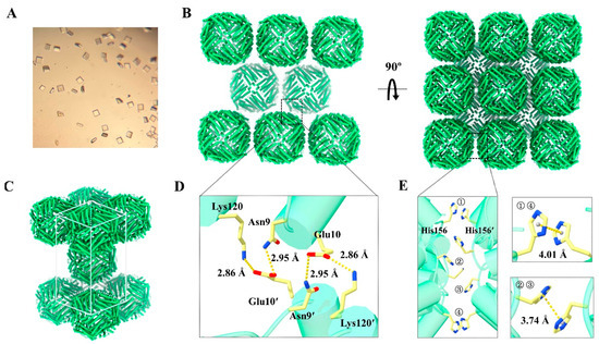 Like ferritin, many natural protein architectures are precise assemblies of protein subunits that can be viewed as molecular Lego sets, such as actin filaments, viral capsids, lumazine synthase, and carboxysome shell [6,7]. Subunit self-assembly facilitates the generation of elaborate systems of more advanced functionalities with high precision, efficiency, and adaptability. Moreover, food proteins such as α-lactalbumin, lysozyme and soyabean protein could self-assemble to form supramolecular architectures under specific conditions, sequentially being applied in nutrient delivery and food system stability [8]. Inspired by subunit self-assembly and natural protein assemblies, scientists endeavor to create artificial protein assemblies (from nm to μm), including one-dimensional (1D) nanofilaments or nanotubes [9,10], two-dimensional (2D) nanosheets [11,12] and three-dimensional (3D) protein crystalline arrays [13,14], that execute complex, multistep biochemical processes or form structural materials [15,16]. Here, 3D protein nanocage lattices have aroused considerable interest since the protein cavity can be filled with inorganic nanoparticles or proteins, thus producing highly ordered functional superlattice, e.g., 3D quantum dot organizations or enzymatic arrays [17,18,19,20]. Additionally, 3D protein nanocage lattices contain two spatially segregated compartments, namely the inherent inner cavity of the protein nanocage and the interglobular space of the lattice. Consequently, our recently constructed 3D Thermotoga maritima nanocage superlattices could serve as a platform for the hierarchical encapsulation of two different cargoes, Mg2+ and carbonic anhydrase for the efficient conversion of CO2 into MgCO3 nanoparticles under mild conditions [21,22], which represent a new class of protein vehicles for multicomponent encapsulation and delivery. Different 3D superlattices have distinct arrangement, interglobular spaces and emergent properties for use in the fields of food, nutrition, and medicine. However, constructing 3D protein lattices with a reversible structure transformation property remains a daunting task.
