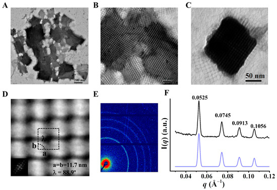 To induce the P156HAfFer molecules to assemble into protein arrays with single SC lattices rather than the above observed mixture, we screened the solution conditions using different salt ions with different concentrations at pH 8.0. It was found that upon the addition of Ni2+ ions (100–400 equiv. of ferritin) to the protein solution (2.0 µM), the P156HAfFer molecules form only one kind of highly ordered assembly in solution, as revealed by means of TEM (Figure 4A–C), whereas the wild-type AfFer nanocages remain almost monodispersed under the same conditions (Figure S8), demonstrating that His156 is responsible for the formation of the ordered protein assemblies. Afterwards, FFT based on TEM was performed to obtain a superior map of the ferritin array, which illustrates the following unit cell parameters: a = b = 11.7 nm, and λ = 88.9°, where a and b refer to the center-to-center distance between adjacent nanocages in columns or rows, respectively (Figure 4D). The value of 11.7 nm is consistent with the ferritin’s outer diameter of 12 nm, and the angle of 88.9° between the base vectors of the unit cell is close to a right angle of 90°, suggesting that the P156HAfFer nanocages form SC superlattices. The resultant protein assemblies were further analyzed via SAXS to determine the arrangements and parameters of the superstructure. The samples gave rise to centric diffraction rings in the 2D SAXS, indicating a high long-range order and large domain size of the superlattice (Figure 4E,F). The identified q values from the azimuthally integrated curve stand at 0.0525, 0.0745, 0.0913, and 0.1056 Å−1, which correspond to the Bragg reflections of the SC lattice ((hkl) = (100), (110), (111), (200), qn/q* = 1: : : ) [14]. The lattice constant determined from the data is a = 11.90 nm, corresponding to the interplanar distance of the cubic crystal system, which is nearly identical to the exterior diameter (~12 nm) of the ferritin nanocage. These results confirmed that the designed P156HAfFer nanocages can self-assemble into pure SC arrays under the current conditions (Figure S9).
