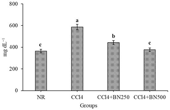 Effect of B. nigra sprout extract at different doses on TLs content in the blood of rats with CCl4-induced renal toxicity (mean ± SE), n = 8, a,b,c: Bars not sharing similar letters differed significantly (p > 0.05), For experimental groups, see Materials and Methods.
