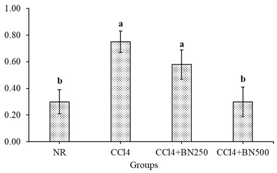 Significant improvements were found in the liver relative weight % after receiving the B. nigra sprout extracts at 250 and 500 mg Kg−1, especially with 500 mg Kg−1 producing the most noticeable results. The formation of fat vacuoles and the production of extrahepatic cholesterol and triglycerides likely contributed to the exponential rise in liver weight, as seen in the CCl4 group [53]. Similarly, the rise of hepatic hydroxyproline content in rats with liver fibrosis produced by biliary obstruction led to large increases in liver weight [54]. Previous research using a CCl4-induced liver injury model demonstrated that the relative liver weight was a more sensitive indication of hepatotoxicity than the relative liver weight [55].