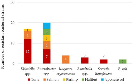 Resistance to gentamicin and chloramphenicol was observed in 54% and 35%, respectively. Gentamicin resistance was predominantly detected in Klebsiella spp. (50%) and Enterobacter spp. (38%), as the rest of the resistant isolates were of the genus Raoultella spp. The resistance to chloramphenicol was observed in Enterobacter spp. (59%), Klebsiella spp. (29%) and S. liquefaciens (12%) and isolated from fish and seafood from supermarket cooling counters and sushi. This type of antibiotic resistance used to be detected in bacteria isolated from dishes such as sushi [,].