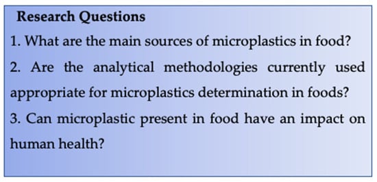 This review was designed systematically, following the PRISMA guidelines []. Firstly, the main concepts concerning microplastics discussed in this review were identified by formulating the “Research questions” (Figure 1).