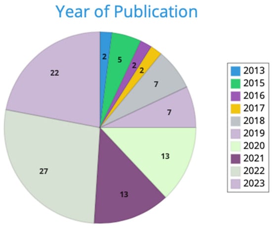 The research of papers by means of search terms identified in the Scopus and PubMed databases returned a total of 1795 papers (net of duplicates). Therefore, 856 articles were excluded through the title and abstract screening. The remaining 939 papers were screened by reading their full text. A total of 64 papers remained and were included in the present review. In total, 27.7% of papers included were published in 2022, whereas 21.7% were published in 2023 (Figure 2).