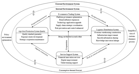 As the external environment, the environmental system’s changes impact various elements within the ecological system. The service support system provides foundational support, while the agri-food production system and logistics distribution system function as critical upstream and downstream components. The e-commerce transaction system acts as a nexus and driver. Specifically, the e-commerce transaction system symbiotically enhances logistics efficiency with the logistics distribution system, collaborates harmoniously with the service support system to augment supply chain coordination, propels green transformation in the agri-food production system, and guides the logistics system to reduce environmental impact. These systems collaborate and innovate synergistically around the core of the cross-border e-commerce transaction system, collectively propelling the sustainable development of the supply chain. The specific content is shown in Figure 2.