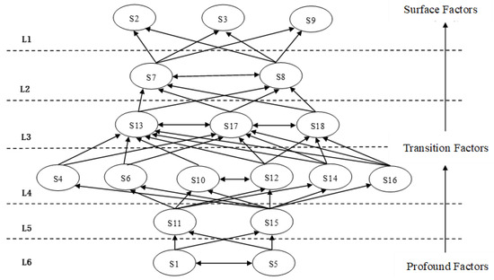 - Construct ISM model: Based on the elements, which satisfy Formula (10), build a hierarchical structure. In each extraction, remove the used elements and repeat the process until all elements are categorized into different hierarchical levels.