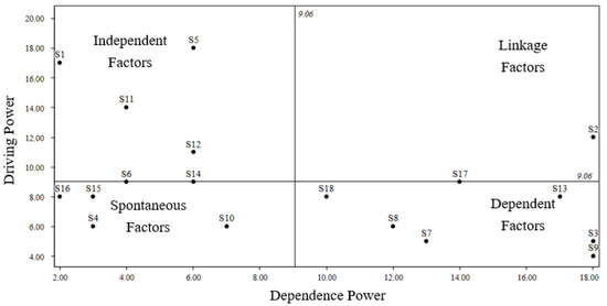 - Calculate dependency and driving force values: Sum the rows and columns of the reachable matrix M to obtain the driving force and dependency values of each factor. The driving force indicates the extent to which a factor influences other factors, while dependency indicates the degree to which a factor is influenced by other factors.