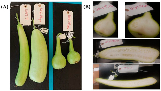 Bottle gourd (Lagenaria siceraria L.) (2n = 2x = 22) originated in sub-Saharan Africa, belongs to the family Cucurbitaceae [1] and is consumed as a vegetable worldwide, but predominantly in Asian countries [1]. Its fruit is characterized by having a yellowish green rind and a whiter pulp [2], with a diverse fruit shape including round, pyriform, hulu (double-gourd), slender straight, corbel, long handled, round and tubby [3,4]. Bottle gourd fruit is used for food consumption and for medicinal and decorative purposes. Additionally, the bottle gourd plant provides an excellent source of rootstock to the other cucurbit crops, contributing to disease resistance and cold tolerance [5,6,7].
