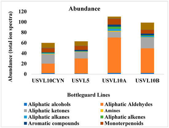Abundance (total ion spectra) of compositions of the major classes of volatile organic compounds (VOCs) in the fruit of the tested bottle gourd lines, USVL10CYN, USVL5, USVL10A and USVL10B.