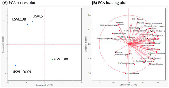 Principal component analysis (PCA) of 60 important volatile compounds measured in the fruits of the tested bottle gourd accessions. (A) PCA scores plot and, (B) PCA loadings plot.