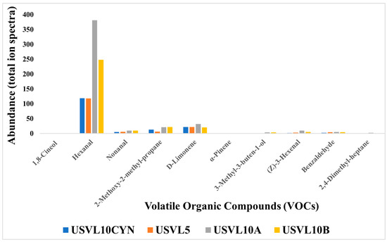 Based on the functional characteristics, a total of nine compounds were found to be important for various purposes. These compounds consisted of hexanal, nonanal, 2-methoxy-2-methylpropane, D-limonene, α-pinene, 3-methyl-3-buten-1-ol-, (z)-3-hexenal, hexanal, benzaldehyde, 2,4-dimethyl-heptane and 1,8-cineol (Figure 5). These functionally important VOCs play an important role in plant disease management and also contribute to the health care industry. Among our tested accessions, USVL10A showed a higher abundance ratio for hexanal, nonanal, 2-methoxy-2-methylpropane and D-limonene. USVL10B is ranked second for the appearance of hexanal, nonanal, 2-methoxy-2-methylpropane, D-limonene in our study. However, we will consider USVL10A to be the most prominent candidate for its suitability to be used for plant disease management in agriculture and health care industry.