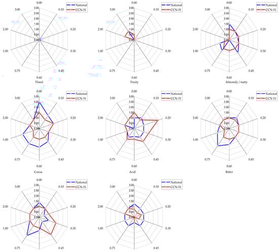 - Vera Chang, J.F.; Vallejo Torres, C.; Párraga Morán, D.E.; Macías Véliz, J.; Ramos Remache, R.; Morales Rodríguez, W. Atributos físicos-químicos y sensoriales de las almendras de quince clones de cacao Nacional (Theobroma cacao L.) en el Ecuador. Cienc. Tecnol. 2015, 7, 21–34. [Google Scholar] [CrossRef]