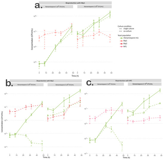 Regarding their bioprotective effect with an initial population of 5.104 CFU/mL of Hanseniaspora, both strains showed significant changes in the growth parameters of the Hanseniaspora mix. When inoculated with strain Mp2, Hanseniaspora was unable to grow. The population persisted for 24 h before declining (Table 4, Figure 1b). The Hanseniaspora population in co-culture with the Mf1 strain exhibited a similar µmax value to that in single culture, but a lower final population (p < 0.05) (Table 4, Figure 1c). In co-culture with Mf1, the Hanseniaspora population exhibited similar growth kinetics to those in single culture for the first 24 h, but interaction with Mf1 led to its death after 24 h of growth (Figure 1c).