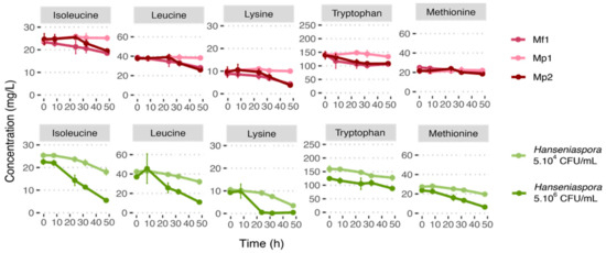Lysine was the amino acid consumed most by both Metschnikowia strains, followed by leucine (30%), tryptophan, and isoleucine (20% for both strains). The consumption of tryptophan started rapidly (after 7 h and 3 h of culture for Mp2 and Mf1 strains, respectively) (Figure 2, Figure S2). However, this high initial consumption stopped after 30 h of culture. It is also worth noting that isoleucine consumption kinetics differed between the two strains. Strain Mf1 started to consume isoleucine after 8 h growth, whereas the Mp2 strain consumed it only after 24 h. But the same amount was consumed by both strains in 48 h.