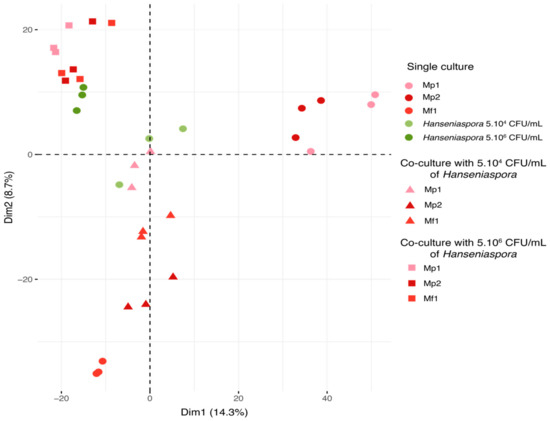 According to this representation, several groups of samples were found. Firstly, all the triplicates were grouped together, demonstrating good reproducibility of the experiments and analyses. The bioprotective strains in single cultures were discriminated according to species by the two dimensions. Hanseniaspora single cultures and co-cultures were separated by the initial Hanseniaspora concentration, and co-cultures appeared closer to the single cultures of Hanseniaspora than the Metschnikowia single culture according to the second dimension. All the co-cultures with an initial concentration of Hanseniaspora at 5.106 CFU/mL displayed a metabolomic footprint similar to that of the Hanseniaspora (5.106 CFU/mL initial) single cultures. Regarding the co-cultures with 5.104 CFU/mL of Hanseniaspora, co-cultures with Mp1 were comparable to the Hanseniaspora single cultures, unlike co-cultures with Mf1 and Mp2. This separation was consistent with the previous observations on growth kinetics with an initial Hanseniaspora concentration of 5.104 CFU/mL. Indeed, co-cultures with Mp1 were found to be very similar metabolically to Hanseniaspora single cultures, explained by the lack of bioprotective effect of the strain. Furthermore, the Mp1 strain exhibited little growth in this condition, contrary to Hanseniaspora, which predominated in co-culture. In contrast, co-cultures with Mf1 and Mp2 were more distant from the Hanseniaspora single culture with a stronger difference in metabolomic footprint for the co-culture with Mp2. The difference in inhibition kinetics between these two strains may explain the effect observed in the metabolic footprint associated with each of the two strains tested in co-culture. To investigate the nature of these different metabolic footprints in greater detail, we chose to focus on only single cultures of the three strains of Metschnikowia and the Hanseniaspora single and co-cultures at an initial concentration of 5.104 CFU/mL for subsequent data analyses.