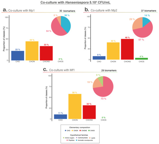 Among the co-culture biomarkers, CHON-type compounds were strongly represented in the three conditions, but co-culture with Mp2 led to a higher proportion of CHONS compounds. Among the four elementary classes, co-cultures with Mp1 and Mf1 shared more similarities, but regarding the putative chemical families, co-cultures with Mp2 and Mf1 (the two conditions with a bioprotective effect) showed a higher proportion of compounds associated with potential peptides and lipids, unlike co-culture with Mp1, which was represented mainly by peptides and aromatic compounds (Figure 5).