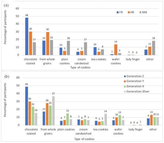 Regarding the type of cookie, Generation Silver prefers whole-grain cookies, while the younger generations, especially Generation Z, prefer chocolate-coated cookies (Figure 1b). The assumption is that the younger generations value taste over nutritional value and healthy eating. This was also confirmed by responses to the question of whether they consider food to be one of the greatest pleasures, which Generation Z strongly agreed with, compared to the other generations, who partially agreed (median). Consistent with a previous study [34], it was found that Generation Z does care less about healthy eating and that they place less value on health advice. Overall, chocolate-coated cookies remain the most popular option, but Generations X and Silver tend to prefer whole-grain products due to their more health-conscious lifestyles.