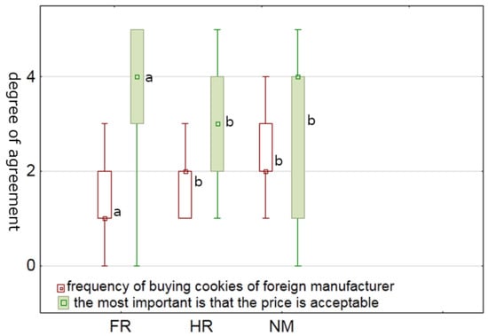 The influence of price and manufacturer on purchase intention by country of origin; FR = France, HR = Croatia, NM = North Macedonia (1 = never/I do not agree at all; 5 = always/I completely agree). Boxplots with different letters represent statistical difference (p < 0.05) within the same question between countries or generations.