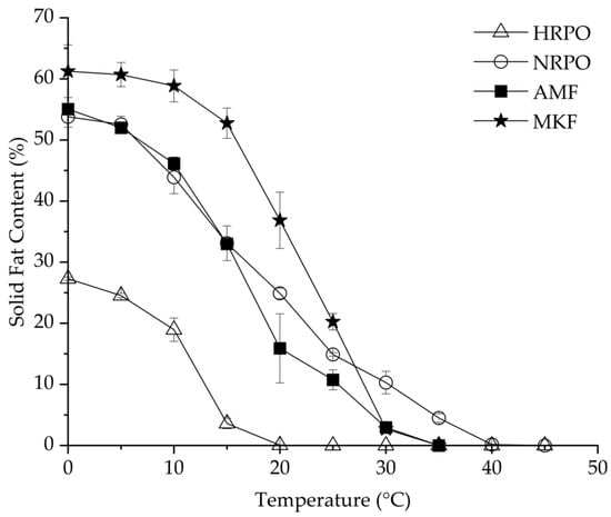 RPOs could be used as cooking or frying oils, shortenings, and confectionary fats, based on their SFC profiles [54]. SFC is one of the most important parameters to evaluate the heat-stable properties of fat [55]. Figure 1 shows SFC changes of HRPO, NRPO, MKF, and AMF, ranging from 0 to 40 °C. The HRPO showed the lowest SFC values at all the studied temperatures, decreasing from 25% to zero from 0 to 20 °C. Therefore, it was suggested for use as a cooking oil. In contrast, the NRPO exhibited a relative wide plasticity range, from 0 to 40 °C. The values were close to those of AMF at 0–15 °C, decreasing from about 55% to 35%, and higher at 20–40 °C. This indicated that the NRPO shared similar plasticity with AMF but had higher heat-stable properties. The different SFCs of the NRPO and the HRPO resulted from their TAGs, which contained palmitic acids. MKF exhibited the highest SFCs from 0 to 25 °C, ranging from 61.3% to 20.3%, making it possible to improve the heat-stable properties of the RPOs at room temperature by physical blending [56].