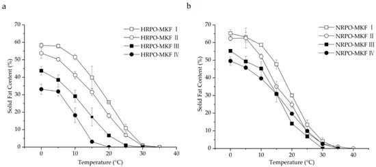 Solid-fat contents of binary blends consisting of MKF with (a) HRPO and (b) NRPO. HRPO-MKF I, II, III, and IV represent HRPOs accounting for 20%, 40%, 60%, and 80% in the binary blends, respectively. NRPO-MKF I, II, III, and IV represent NRPOs accounting for 20%, 40%, 60%, and 80% in the binary blends, respectively.