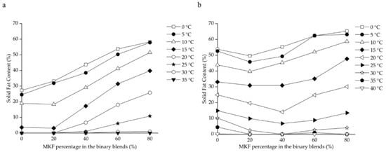 The SFC changes of binary blends consisting of RPOs and MKF are shown in Figure 2. The heat-stable properties were significantly improved in all the HRPO-MKF blends, and the SFCs decreased rapidly when heated, which is useful in acquiring good mouthfeel [57]. The compatibilities of the binary blends can be studied by determining the SFC changes in the solid percentages with various proportions of the original fat [58]. A binary diagram of the mixtures containing HRPO and MKF showed that the SFC values increased in the concentrations of MKF (Figure 3a). Similar behaviors were observed in the binary blends consisting of hard fat with palm oils, soybean oil, cotton oil, and palm kernel oil [59,60]. The plasticity capabilities showed the degree of fat passing from a solid to a liquid at measured temperatures. The plasticity capabilities of the binary blends at room temperature were also improved, based on different blending ratios. For example, the SFC values of the HRPO without MKF was between around 27% at 0 °C and 0% at 20 °C. The values of the binary blends containing 60–80% MKF gradually decreased from 55–60% at 0 °C to around 10% at 25 °C (Figure 2a), making the blends suitable for the production of heat-stable cream substitutes [61].