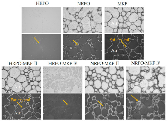 Polarized light micrographs (bottom) and the corresponding optical micrographs (top) for the whipped creams (the scale bar indicates 100 μm) of whipped creams. The yellow arrows point to fat crystals. HRPO-MKF II represents HRPO accounting for 40% in the binary blends. HRPO-MKF IV represents HRPO accounting for 80% in the binary blends. NRPO-MKF II represents NRPO accounting for 40% in the binary blends, NRPO-MKF IV represents NRPO accounting for 80% in the binary blends.