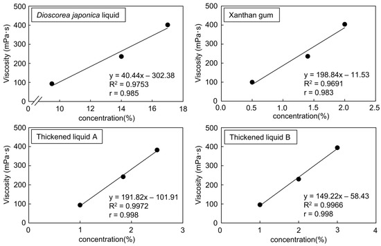 Relationship between concentration and viscosity in each sample. Dioscorea japonica liquid was evaluated at concentrations of 9.5%, 14%, and 17%. Xanthan gum was evaluated at concentrations of 0.5%, 1.4%, and 2.0%. Thickened liquid A was evaluated at concentrations of 1.0%, 1.8%, and 2.5%. Thickened liquid B was evaluated at concentrations of 1.0%, 2.0%, and 3.0%. The solutes were dissolved in distilled water. The viscosity of all samples was assessed using a viscometer at 20 °C after five independent measurements.