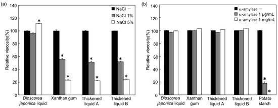 Effects on stability after NaCl addition and resistance on α-amylase activity to viscosity of each sample. (a) In each sample (pH = 7.0), 0%, 1%, or 5% NaCl in 20 mM sodium phosphate buffer was added. The viscosity of all samples was measured using a viscometer at 20 °C after five independent measurements. (b) Potato starch was used at a concentration of 5.3%. In each sample, or potato starch as a positive control, 0, 1, or 1000 μg/mL of α-amylase was added. The solutes were dissolved in distilled water. The viscosity of all samples was measured using a viscometer at 20 °C after five independent measurements. Sample concentration: Dioscorea japonica liquid 15% (a) and 12% (b), xanthan gum 0.7%, thickened liquid A 1.8%, thickened liquid B 2.1%. The values of relative viscosity are means ± SE represented as relative values with respect to the amount without NaCl (a) or α-amylase (b). * p < 0.01 compared with 0% NaCl (a) or 0 μg/mL α-amylase (b).
