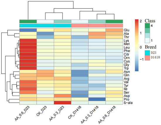 In this study, a total of 42 amino acids and amino acid components were detected in this test. After eliminating the elements with less than a 50% detection rate, 22 amino acids and amino acid components, including aspartate, were obtained (Table 1), along with the comparative heat map of amino acid component contents (Figure 1). Different varieties of potatoes showed variations in the composition of the 22 free amino acids in the tubers after applying foliar fertilizer. Most of the amino acid components increased under the conditions of amino acid water-soluble fertilizer treatment, with only a few amino acids, including proline (Pro), ornithine (Orn), and citrulline (Citr), showing lower content in the Dian Shu 1418 variety compared to the control. A small portion of amino acids, such as asparagine (Asn) and glutamine (Gln), were lower in the Dian Shu 23 variety compared to the control. As we all know, aspartate and glutamine will produce acrylamide under high-temperature conditions; acrylamide is a recognized carcinogen; that is to say, after applying amino acid water-soluble fertilizer, Dian Shu 23 tubers are healthier after baking, which is an unexpected finding. The cluster analysis revealed that the amino acid water and fertilizer ratio at a 0.6% concentration benefitted the endogenous amino acid content of Dian Shu 23 treated with 0.3% AA. According to the heat map, it can be seen that the amino acid content changes in the potato tubers of the two varieties after treatment are not completely consistent, which may be caused by the variety effect. However, in the two varieties of potatoes, some endogenous amino acids have the same change trend, and these amino acids may be the focus of our attention. The results of cluster analysis showed that the concentration of water-soluble fertilizer with different amino acids had different effects on the content of free amino acids in tubers of different potato varieties. After clustering, it is obvious that potato varieties are taken as the difference. According to the heat map of this experiment, amino acid water and fertilizer treatment at a 0.6% concentration had the greatest effect on the endogenous amino acid content of Dian Shu 23. It is not difficult to compare the heat map with the endogenous amino acid content table. The contents of the endogenous amino acids of the Dian Shu 23 and Dian Shu 1418 potato varieties were significantly different under CK treatment. Table 1 shows that the free amino acid content in the tuber of Dian Shu 23 is much higher than the endogenous amino acid content of Dian Shu 1418, and most of the amino acid content of the two varieties shows an increasing trend under the treatment of water-soluble fertilizer. The results indicated that the application of water-soluble amino acid fertilizer on the leaf surface had a certain effect on the change in the contents of endogenous amino acid in potato tuber.
