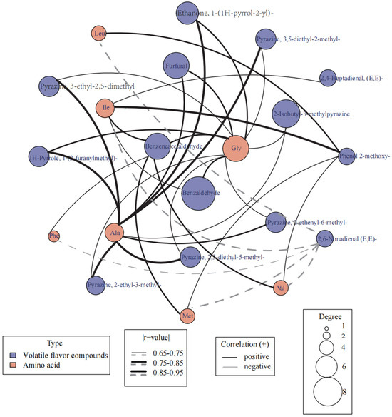 Correlation network diagram between volatile flavor components and free amino acids.