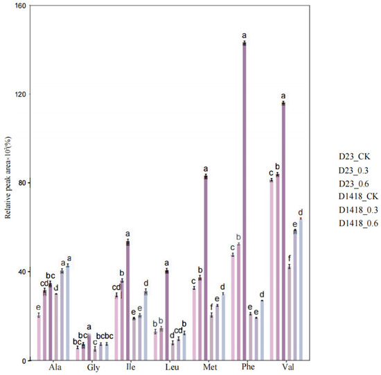 Specifically, the seven amino acids closely related to the composition of volatile flavor compounds are glycine, leucine, isoleucine, valine, methionine, alanine, and phenylalanine. The treatment influences the variations in the content of each free amino acid and exhibits variety-specific effects (Figure 4). Overall, amino acid fertilizer spray has a significant (p < 0.05) impact on Dian Shu 23. According to the figure, the variations in the content of the seven free amino acids in potato tubers are as follows: 0.6_AA treatment > 0.3_AA treatment > CK, and the 0.6_AA treatment achieved a significant level (p < 0.05) compared to the control, indicating that, compared to the 0.3_AA treatment, the 0.6_AA treatment had a more pronounced effect on the endogenous amino acid content in potato tubers. Due to the limited reports on the concentration of amino acid fertilizer, further experimentation is needed to determine the optimal concentration of amino acid fertilizer.