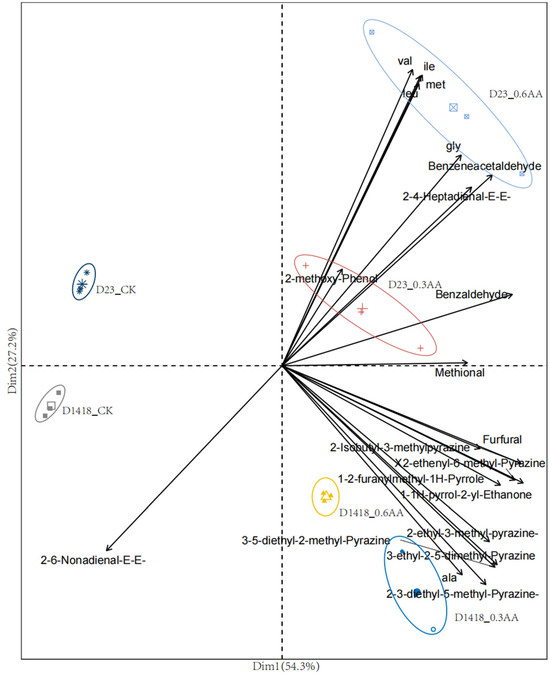 Principal component analysis of main volatile compounds and free amino acids under amino acid foliar fertilizer treatment. We have marked the different levels of processing represented by symbols of different colors.